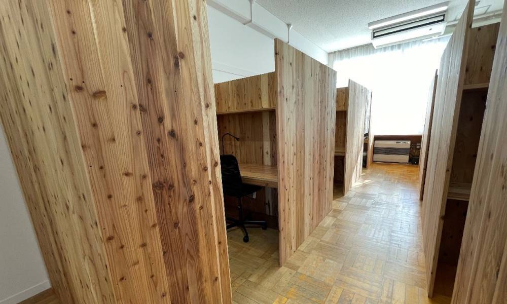 シェアオフィス「研究室」の月額会員専用スペースです。電源、Free Wi-Fiを完備しています。複合機はコワーキングスペース前の機器をご利用ください。月額会員は、荷物を置いておける鍵付きロッカーが貸与されるほか、複合機利用のカウンター代の割引があります。また、いいづなコネクトEASTのコワーキングスペース「ツクリバ WORK ROOM」も無料で利用できます。